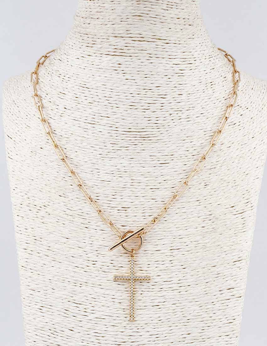 Gold Open Chain with Toggle and Rhinestone Cross 18" Necklace