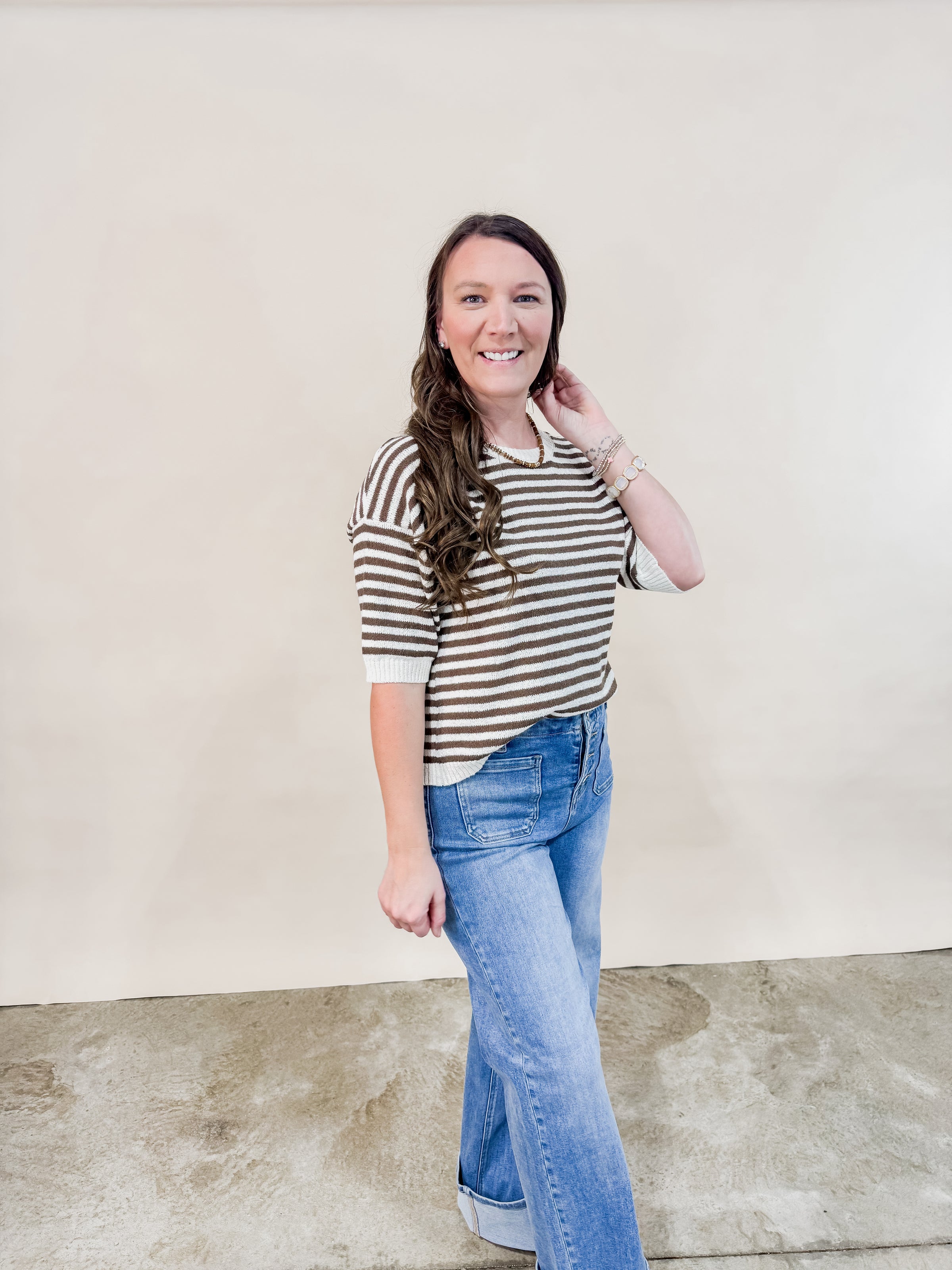 Meet the Kathleen Striped Knit Sweater—your new favorite layering piece with a twist! This charming short-sleeve design features classic stripes and a clever back-button detail that adds unexpected flair. Perfect for mixing and matching with your everyday wardrobe, it's the kind of cozy-casual essential that works harder than it looks. Throw it on over a tee or wear it solo for effortless style.