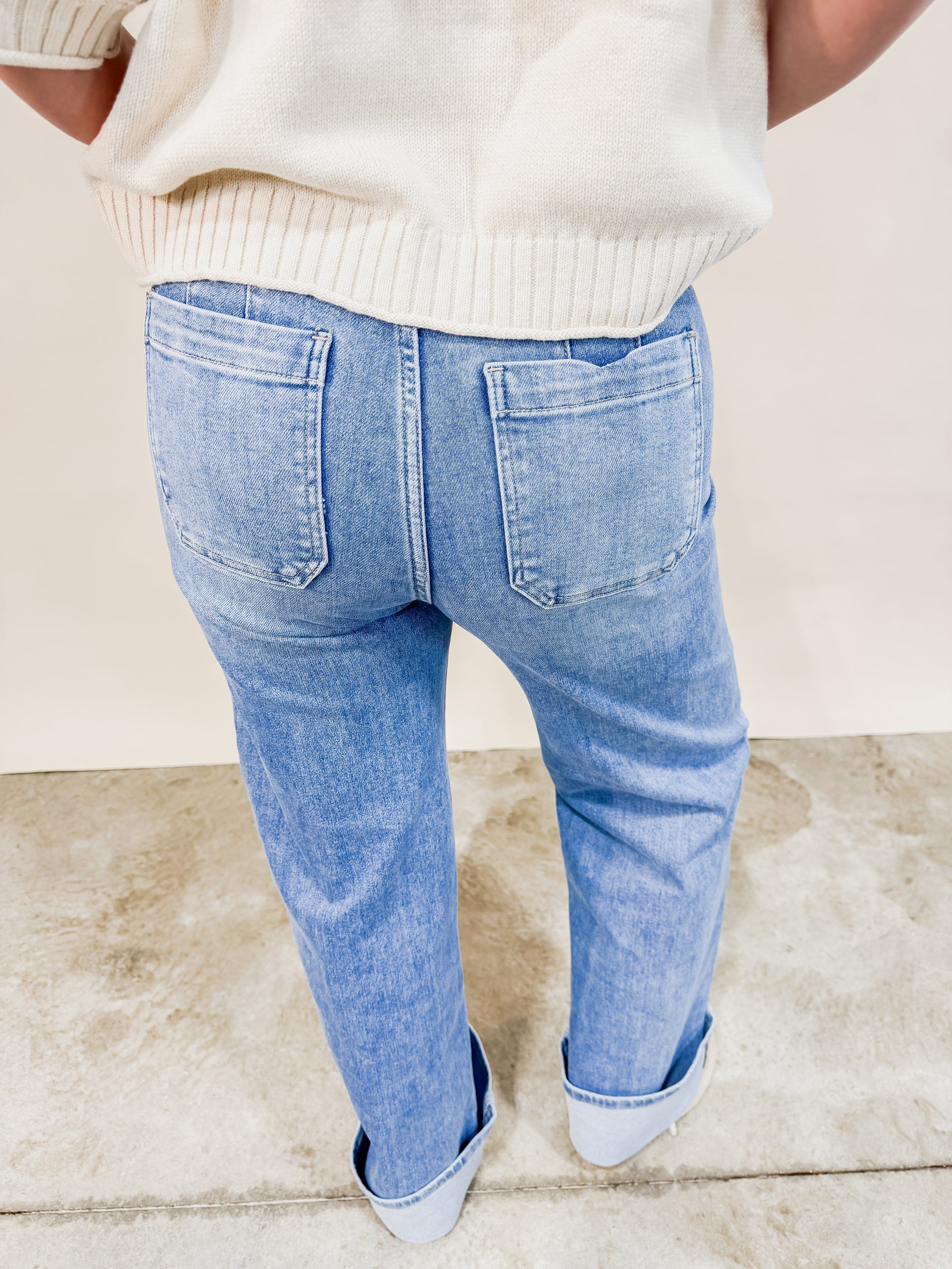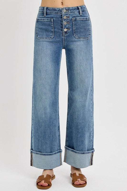 These Risen High Rise Wide Leg Cuffed Jeans bring effortless cool to your everyday rotation. Cut with a flattering high rise and relaxed wide-leg silhouette, they're finished with on-trend cuffed hems and practical patch pockets—perfect for stashing your essentials without sacrificing style. The medium wash strikes that sweet spot between versatile and eye-catching, pairing seamlessly with everything from crop tops to oversized sweaters. Comfort meets confidence in a pair that works as hard as you do.
